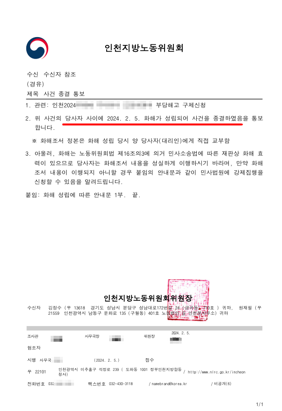 당 법인에서는 회사의 일방적인 근로관계 종료 통보가 ‘부당해고’에 해당한다고 판단하였고, 여러가지 입증자료를 바탕으로 회사측과 화해 종결 처리 하였습니다.
