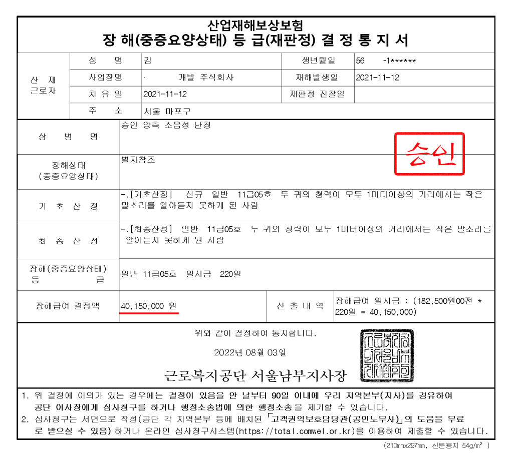 건설현장에서 형틀목공으로 30여년간 근무한 근로자의 소음성 난청에 대해 ‘승인 ‘받은 사례입니다.